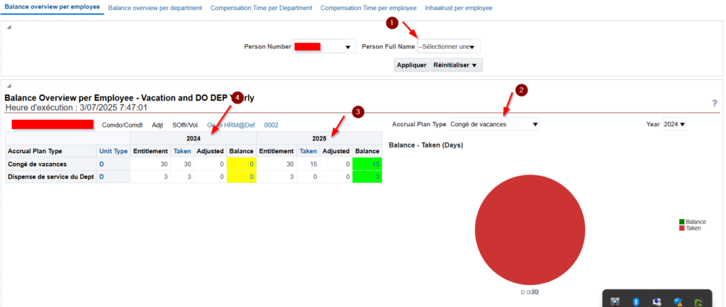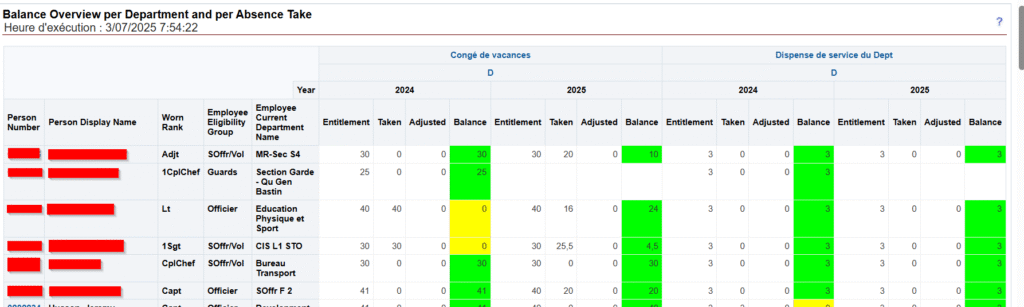 A noter que l’onglet heure de compensation pour le département (Compensation Time per Department) ne semble plus fonctionnel. Si celui pour les compensations en temps par personne reste fonctionnel il est difficilement lisible car les chiffres semblent (actuellement) erronés me concernant. Par contre il liste les heures de compensation obtenues par prestation ce qui peut être intéressant.