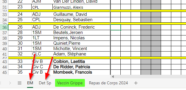 Il s’agit donc d’un fichier Excell classique mais ouvert en ligne et il vous suffira de choisir votre Détachement dans le dessous du document pour trouver la liste des membres de votre personnel dont vous gérez les présences :