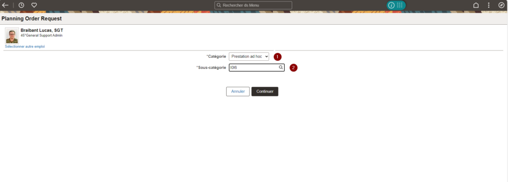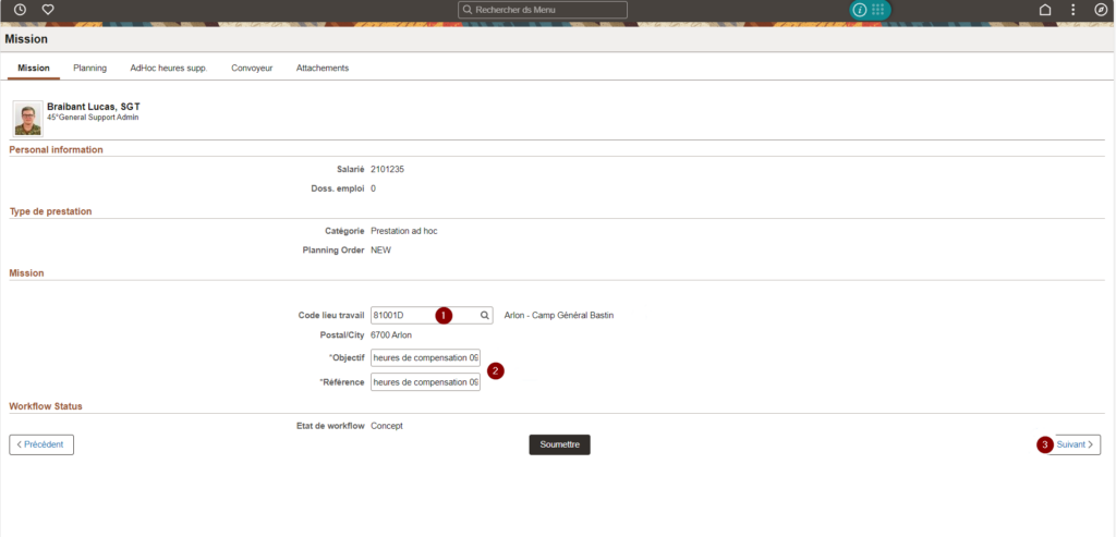 1. Sélectionnez le code de lieu de travail du Département Manœuvre qui est le code 81001D.