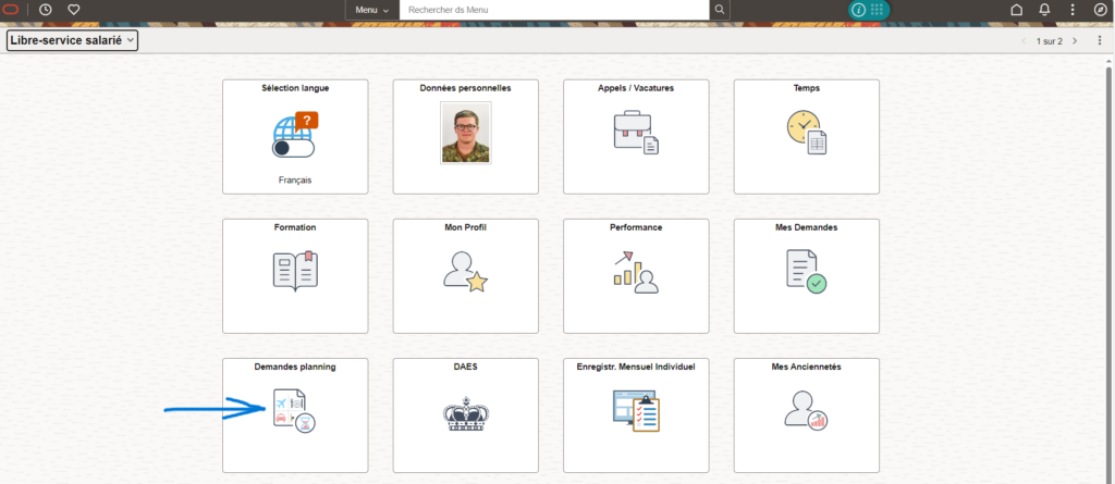 Sur la page par défaut de HRM, cliquez sur « Demandes planning » :
