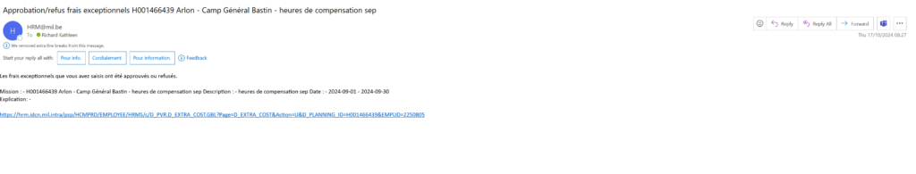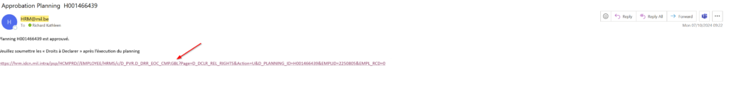 Lorsque la demande est approuvée par le Commandant de Détachement, un email vous est envoyé :