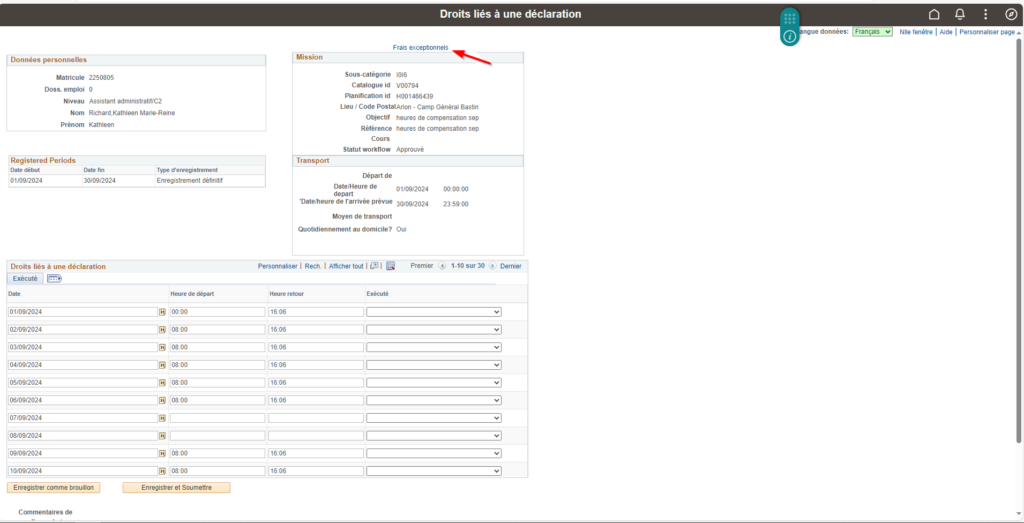 Cliquez sur ce lien pour arriver à votre planning et rendez-vous dans les frais exceptionnels :